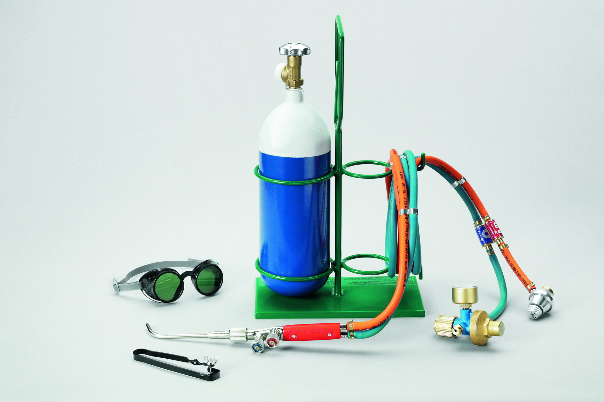 Баллон 2.5л. Общий вес поста 7.8кг. В комплекте горелка, двойной шланг, редуктор кислорода, рама, очки.