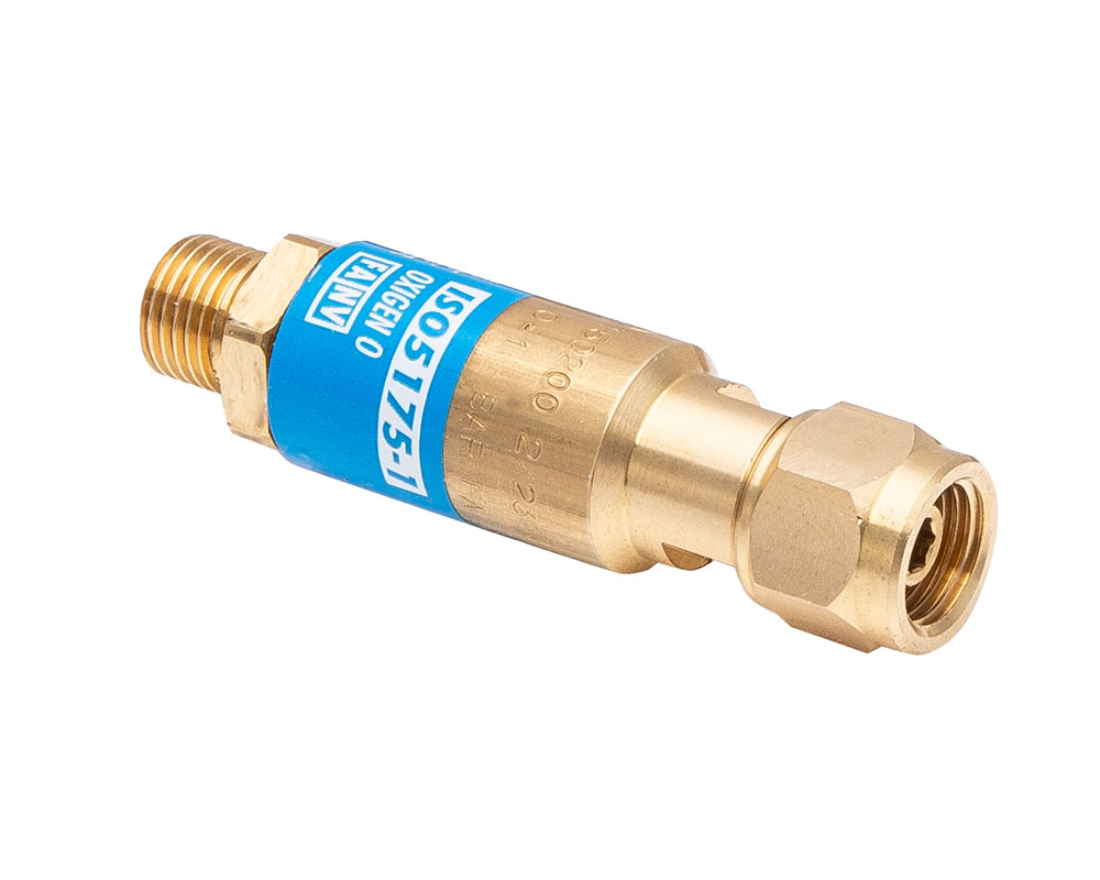 Защитный клапан от обратного удара с двойной защитой для рукояток кислородных горелок. Резьба 1/4″ RH. Максимальное давление 10 бар. Расход 30 м3/ч.