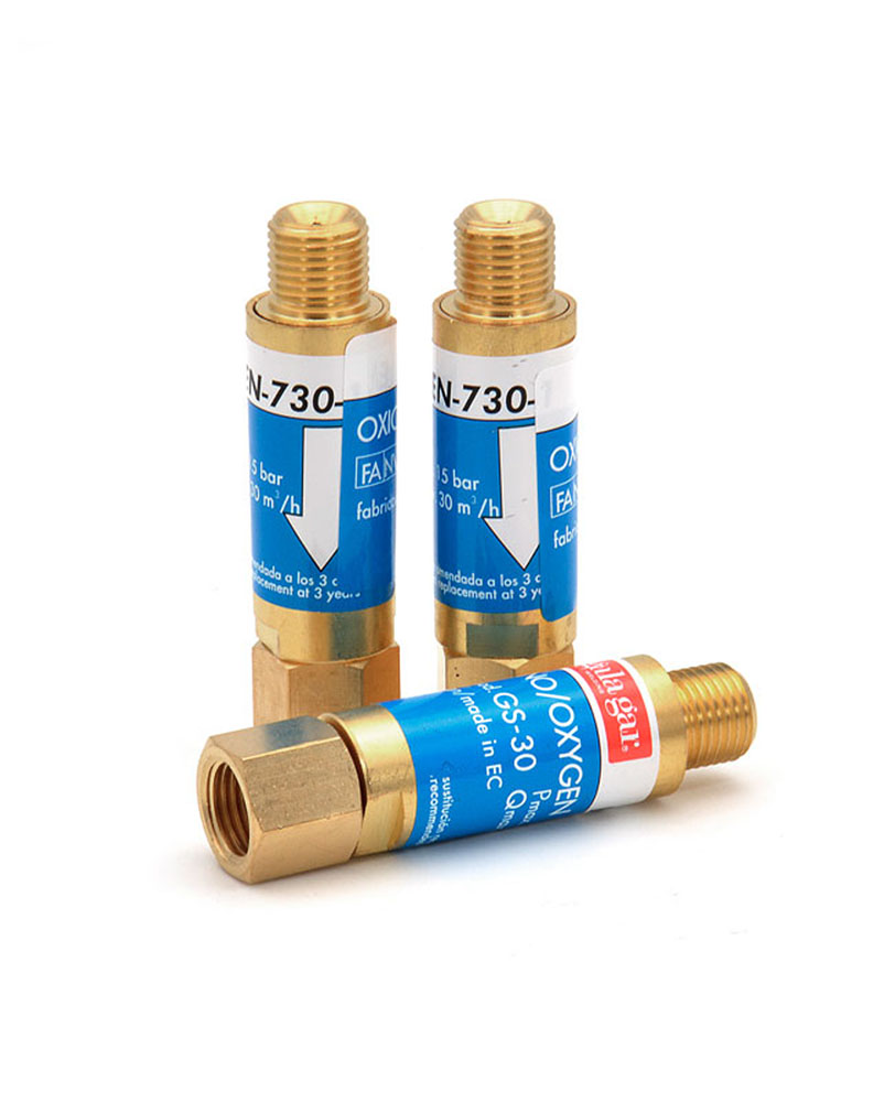 Защитный клапан от обратного удара для рукояток горелок, под кислород OX 1/4 (правая резьба), сделан из из латуни. Максимальное давление 20 бар. Рабочий газ – кислород.