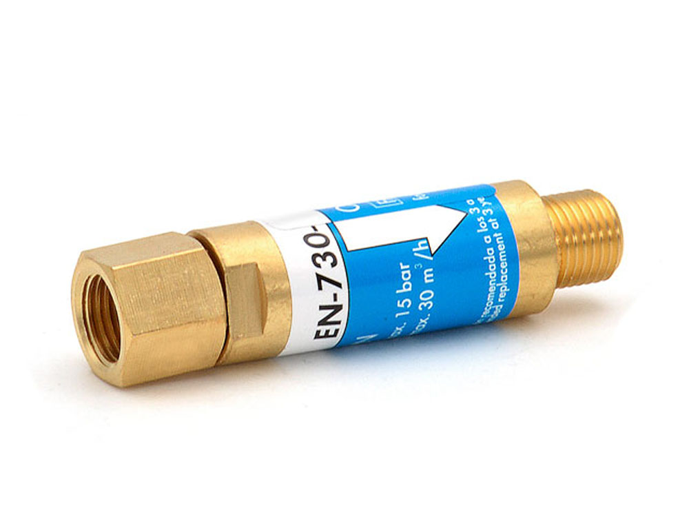 Защитный клапан от обратного удара на кислородный редуктор OX, 1/4″ (правая резьба), сделан из латуни. Максимальное давление 10 бар. Рабочий газ – кислород.