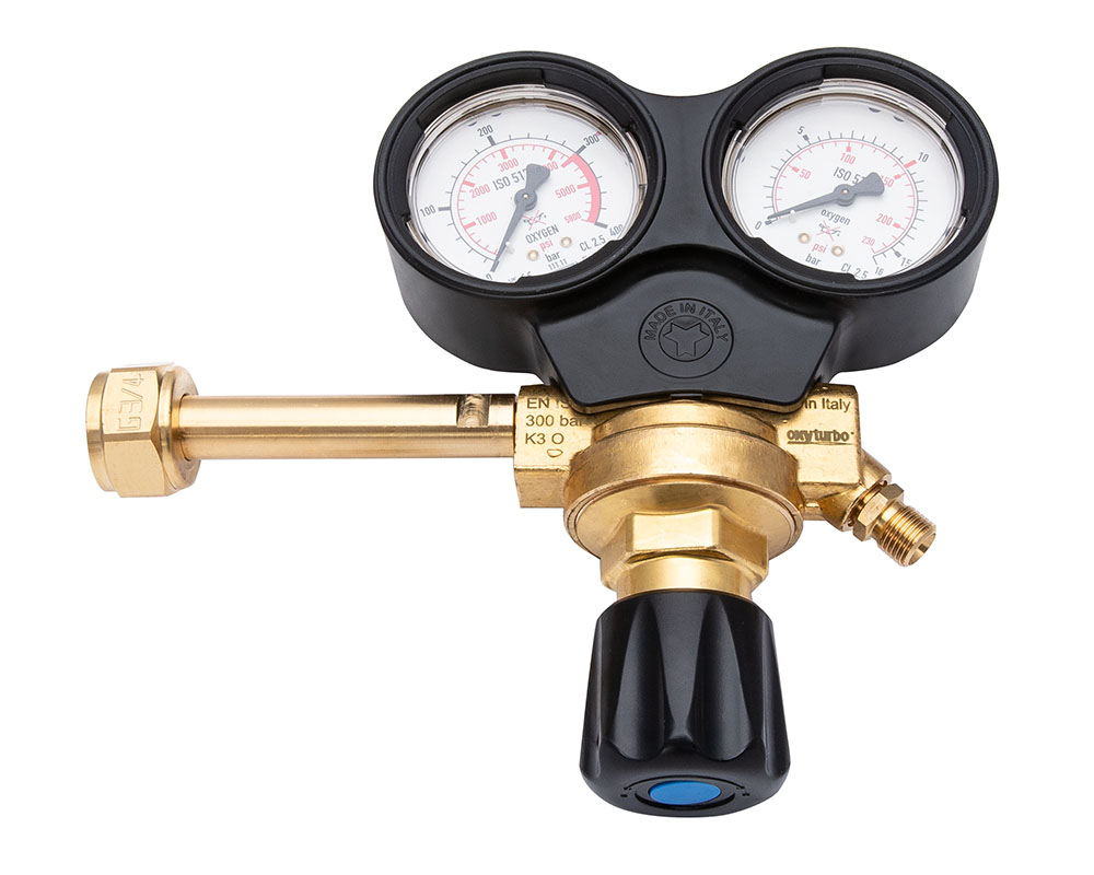 Одноступенчатый кислородный баллонный редуктор с двумя манометрами в защитном кожухе. Макс. выходное давление 10 бар. Номинальная пропускная способность 30 м3/ч.