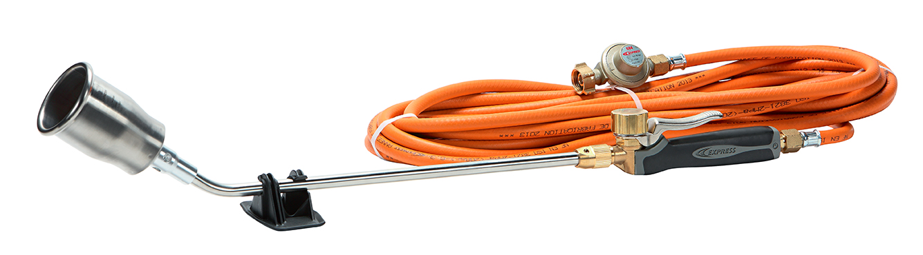Комплект для сварки битумной кровли. Включает в себя рукоятку №620, нержавеющей наконечник диаметром 60мм, гриф 400мм, шланг 10м и редуктор HP на 4 бара.