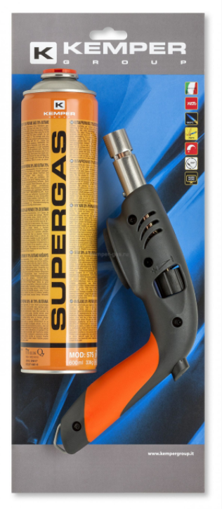 С пьезоподжигом, удобной прорезиненную ручкой, регулятором пламени и крючок для подвеса лампы. С баллончиком 575. Рассчитана на температуру до 1900 °С. Резьба: 7/16.
