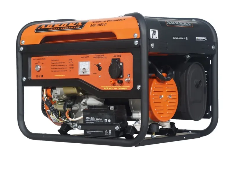 Назначение бензинового генератора Aurora AGE 3500D – обеспечивать подачу электроэнергии в однофазную электросеть напряжением 220 В частотой тока 50 Гц с мощностью токоприёмников до 2,8 кВт в случаях отсутствия штатного энергоснабжения. Использование данного агрегата из двигателя и генератора рекомендуется в холодных регионах: бензогенератор комплектуется аккумулятором для электростартера при сохранении ручного стартера.