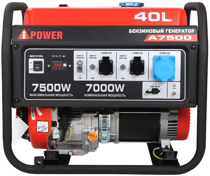 Электрический генератор A-iPower A7500 — однофазная бензиновая модель с ручным стартером. Устройство вырабатывает ток напряжением 230 вольт, обеспечивает номинальную мощность 7 кВт и способно проработать до 9,7 часа при максимальной нагрузке. Данный генератор может быть востребован на объектах с отсутствующем или нестабильным электроснабжением во многих областях деятельности человека. Это, например, загородные дома, строительные или удаленные монтажные площадки и другое.