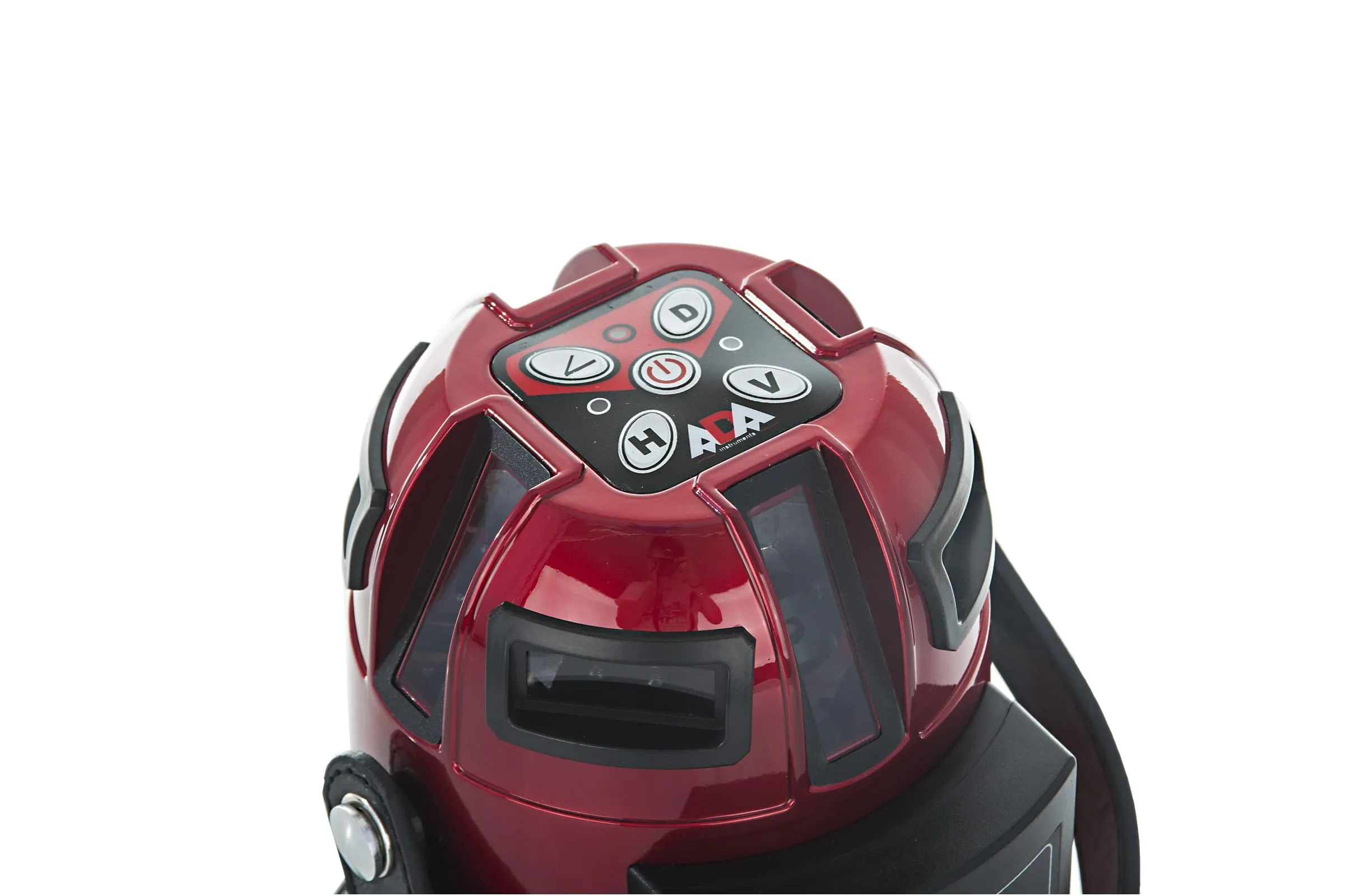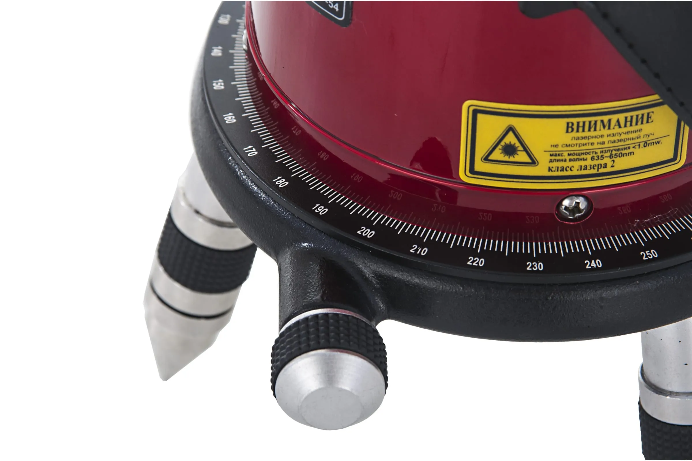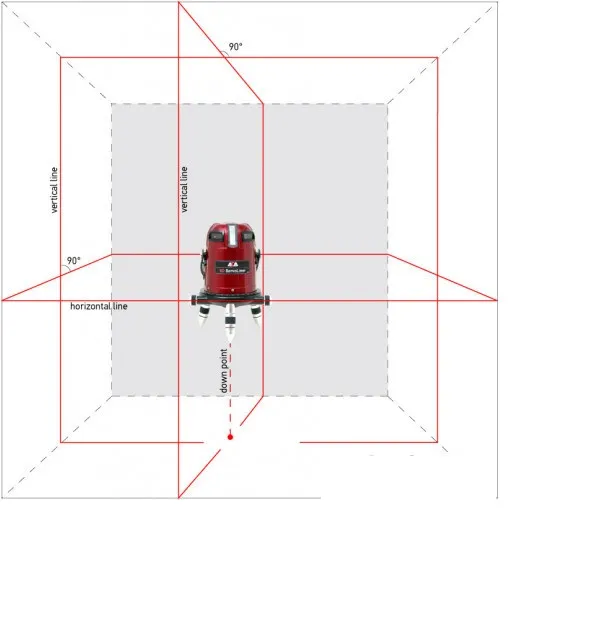 Линии расположены перпендикулярно с точностью ± 0,1 мм/м. Каждая плоскость легко отключается нажатием клавиши сбоку прибора. Функция используется при разметке пола, стен, потолка, установке оборудования и мебели. Уровень установлен на платформе со шкалой. Развертка на 360° позволяет не перемещать прибор при работах в помещениях большой площади. Дальность проецирования — 20 м. Приемник, приобретаемый отдельно, позволяет увеличить значение до 70 м.