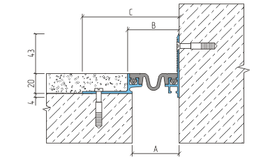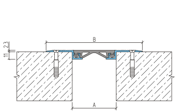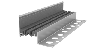 Обустройство деформационных швов с высотой конструкции пола от 15 мм. Монтируется в пространство плиточного клея. Уменьшенная ширина крепежного узла компенсатора позволило минимизировать видимую часть профильной конструкции. По мере износа компенсатор может быть легко заменен.