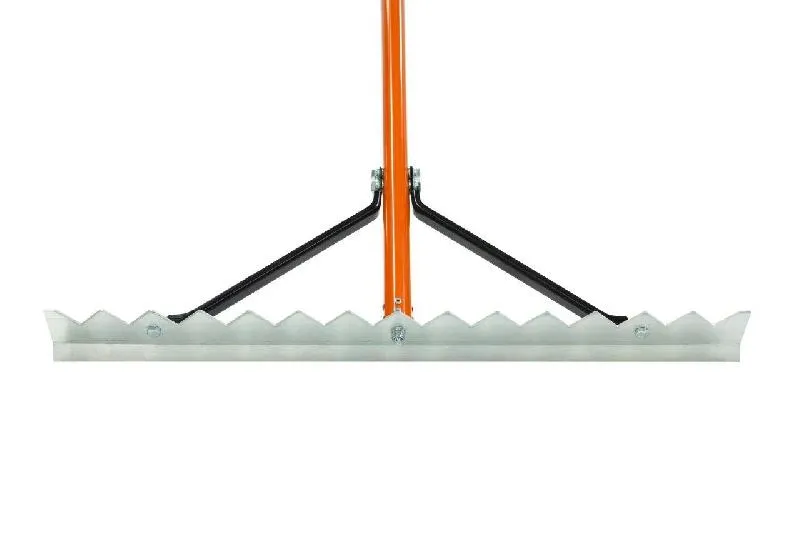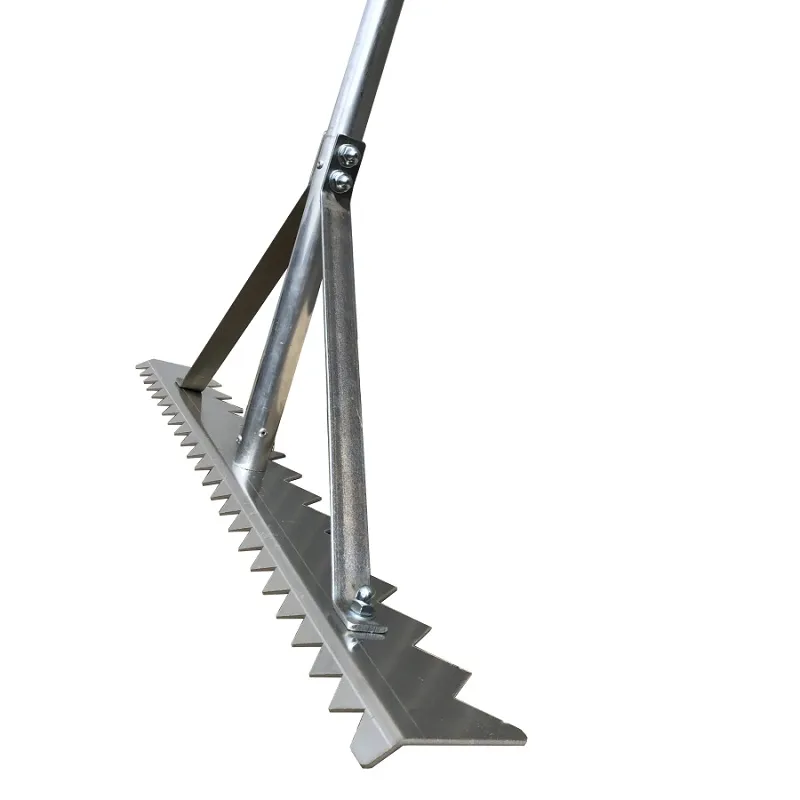 Грабли-гладилка KM-720 — профессиональный строительный инструмент, предназначенный для работ с тяжелыми материалами при устройстве верхнего шара асфальтного полотна. Внешний вид конструкции напоминает садовые грабли: состоит из рукояти и сменной рабочей части — двустороннего металлического полотна с разным размером зубьев с каждой стороны. Благодаря этому, может применяться для разравнивания материала как с мелкой, так и крупной фракцией.