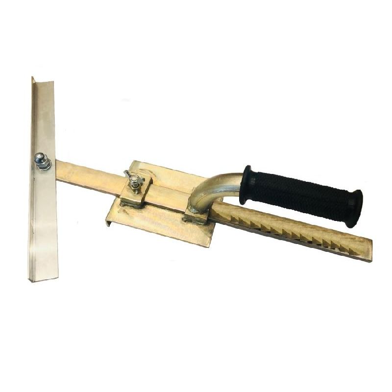 Обладает прочным оцинкованным корпусом, предусматривает наличие устойчивой к ржавчине алюминиевой планки и резиновой рукоятки. Его конструкция предусматривает наличие жесткой пластины с установленным с боку ограничителем. Кроме этого в состав входит направляющая планка, которая скользит в продольном направлении. Ее фиксирует в нужном положении винтовой фиксатор. Угловая планка крутится на конце продольной и стопорится за счет винта. Продуманная конструкция обеспечивает долгий срок службы.