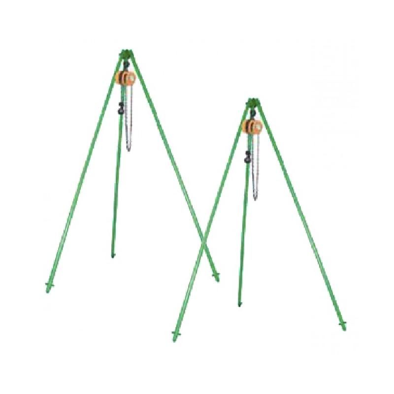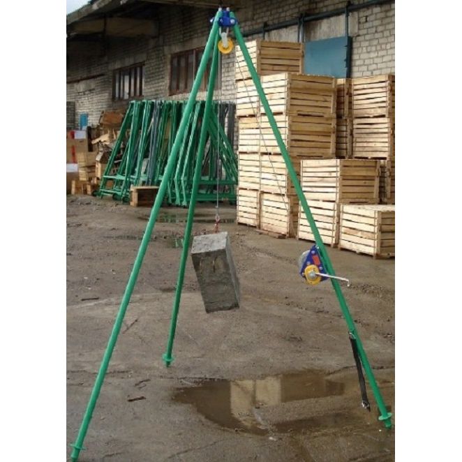 Компактные размеры обеспечивают работу треножника в ограниченном пространстве. Три стойки, из которых состоит тренога, соединены друг с другом кронштейнами. На втулке кронштейна расположена скоба для подвески блока. Устройство с замком в нижней части стоек фиксирует треногу в сложенном состоянии.