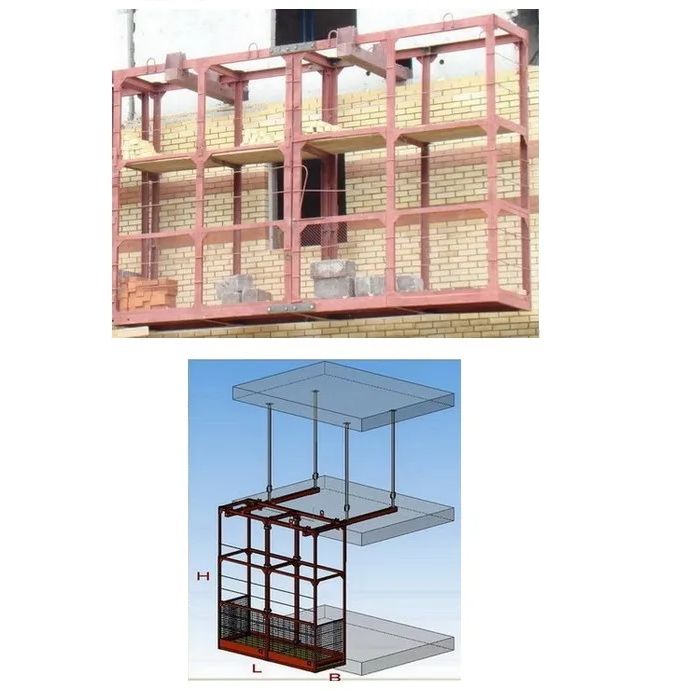 Площадка устанавливается на внешнюю сторону здания, фиксируется выносными балками, которые крепятся к внутренним стенкам строения или его перекрытиям. Перед монтажом изделия на дощатые настилы укладывается строительный материал и инструменты.