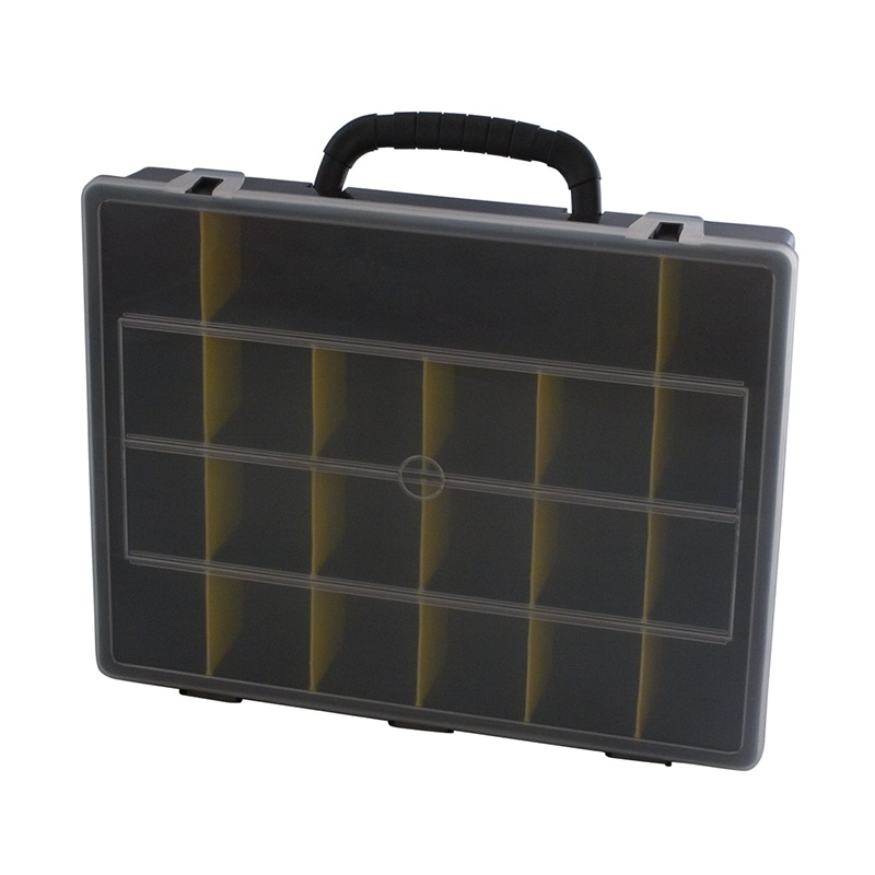 Предназначен для хранения и переноски крепежа и мелких деталей. Выполнен в форме кейса со множеством отделений, в которых удобно размещаются необходимые аксессуары и различные мелочи. Благодаря прозрачной крышке можно видеть расположение крепежа внутри. Пластиковые защелки надежно защищают чемоданчик от непреднамеренного открывания.