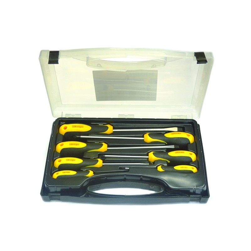 Предназначен для монтажа шлицевого крепежа. Хромованадиевая сталь повышенной твердости. Обрезиненная двухкомпонентная эргономичная рукоятка. Магнитный наконечник. Набор из 7 отверток: плоский шлиц — 3х65, 5х100, 6х150, 8х150, крестовой шлиц — 0х75, 1х100, 2х150.