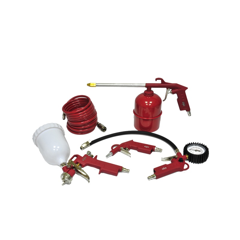 Предназначен для различных видов работ как в домашних, так и профессиональных целях. В комплектацию входят 3 вида пистолетов (для мовиля, для накачки и обдувочный), краскопульт и нейлоновый шланг длиной 5 метров.
