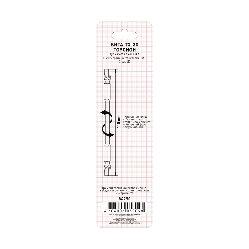 Применяются в качестве сменных насадок в ручном и электрическом инструменте. Хроммолибденовая сталь S2. Производство методом холодной ковки. Высокая твердость и износостойкость. Внутренний шлиц TORX. Магнитный шлиц. Торсионная зона на бите предотвращает повреждение шлица, гасит пиковые нагрузки на электроинструмент.