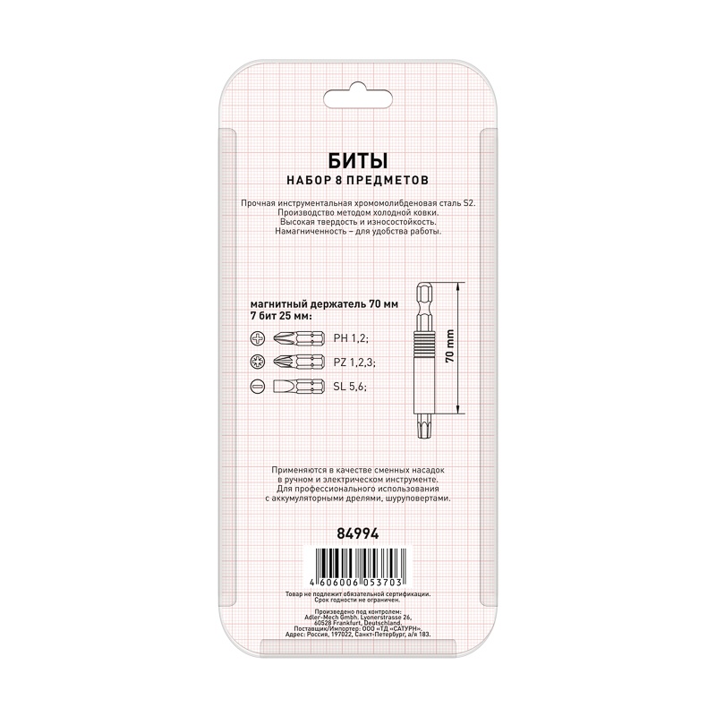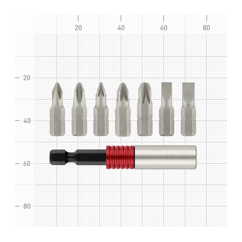 Применяются в качестве сменных насадок в ручном и электрическом инструменте. Хроммолибденовая сталь S2. Производство методом холодной ковки. Высокая твердость и износостойкость. Намагниченные. Комплектация: магнитный держатель 70 мм, крестовой шлиц Phillips (PH-1, PH-2), крестовой шлиц Pozi driv (PZ-1, PZ-2, PZ-3), плоский шлиц (SL-5, SL-6)