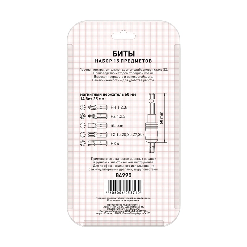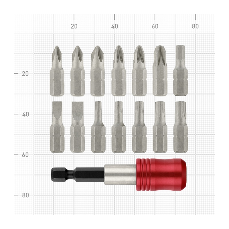 Применяются в качестве сменных насадок в ручном и электрическом инструменте. Хроммолибденовая сталь S2. Производство методом холодной ковки. Высокая твердость и износостойкость. Намагниченные. Комплектация: магнитный держатель 60 мм, крестовой шлиц Phillips (PH-1, PH-2, PH-3), крестовой шлиц Pozi driv (PZ-1, PZ-2, PZ-3), плоский шлиц (SL-5, SL-6), шестигранный шлиц (HX-4), Torx шлиц (TX-15, TX-20, TX-25, TX-27, TX-30)