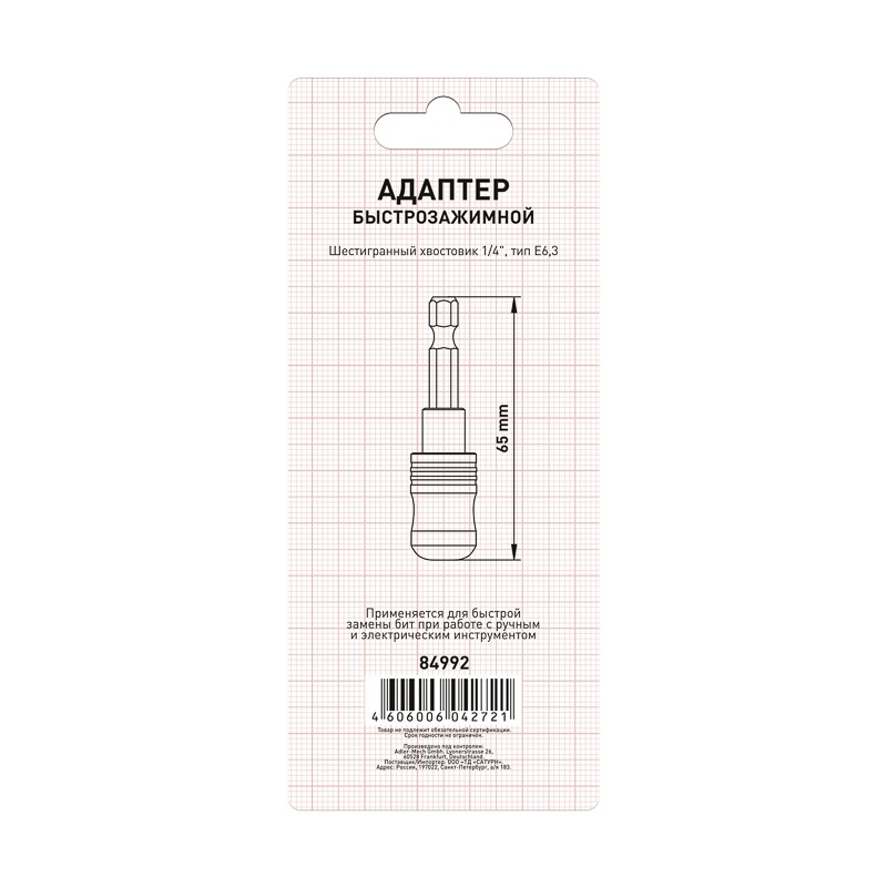 Используется для быстрой замены бит при работе с ручным и электрическим инструментом. Пружинный фиксатор с функцией разблокирования для легкой замены бит. Дополнительный магнитный фиксатор. Шестигранный хвостовик 1/4″Е
