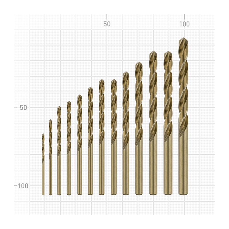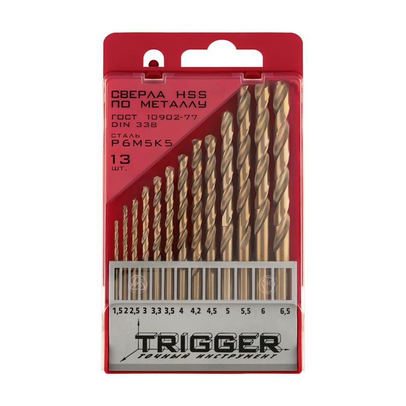 Применяется для создания отверстий в различных типах стали, в том числе легированной и нержавеющей, а также цветных металлов и твердых пластмасс. В набор входят сверла различного диаметра (1.5, 2, 2.5, 3, 3.3, 3.5, 4, 4.2, 4.5, 5, 5.5, 6, 6.5 мм). Шлифованные. Класс точности А1. Высококачественная быстрорежущая сталь Р6М5К5, легированная кобальтом (Со — 5%) для обеспечения наиболее высокой термостойкости сверла. Угол при вершине 135 градусов. Цилиндрический хвостовик.