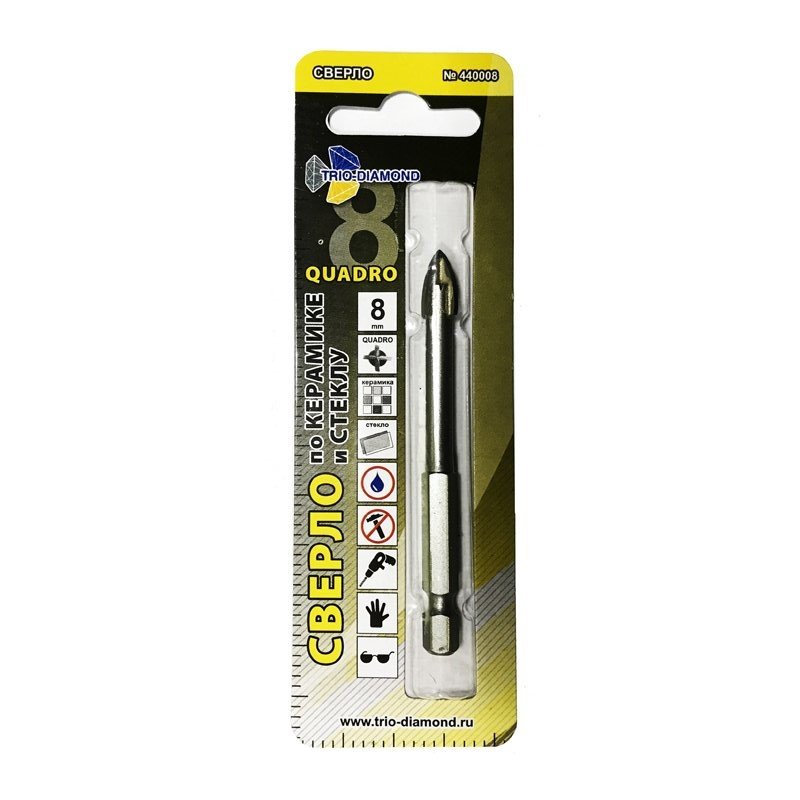 Применяется для выполнения отверстий в кафеле, керамической плитке и стекле. Имеет твердосплавную напайку. Сверло отличается наличием четырех режущих кромок. Тип хвостовика: шестигранник.