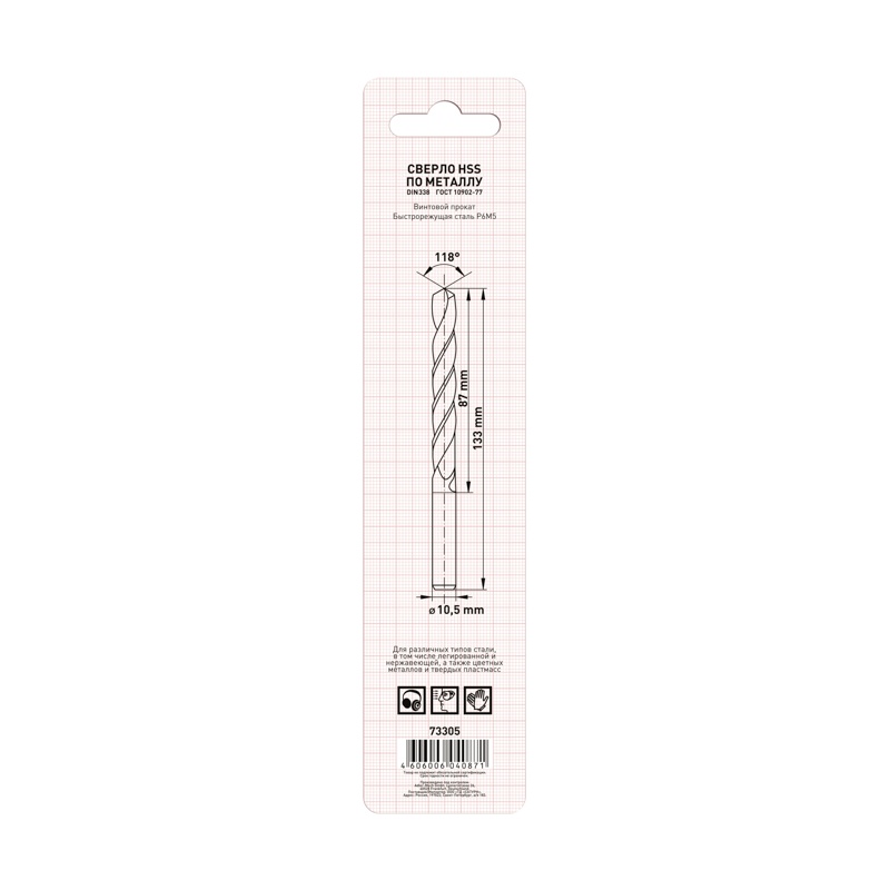 Применяется для создания отверстий в различных типах стали, в том числе легированной и нержавеющей, а также цветных металлов и твердых пластмасс. Винтовой прокат. Класс точности В1. Высококачественная быстрорежущая сталь P6M5. Угол при вершине 118 градусов. Цилиндрический хвостовик. Для использования с электрическими и аккумуляторными дрелями с цилиндрическим патроном. Идеально подходят для использования в вертикально-сверлильных станках с водяным охлаждением. Соответствуют ГОСТ 10902-77.