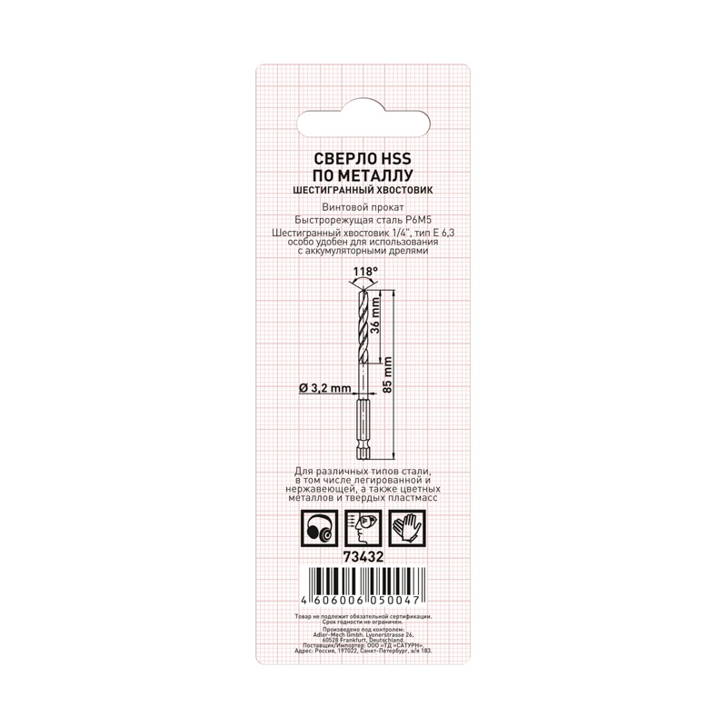 Применяется для создания отверстий в различных типах стали, в том числе легированной и нержавеющей, а также цветных металлов и твердых пластмасс. Для использования с электрическими и аккумуляторными дрелями. Винтовой прокат. Высококачественная быстрорежущая сталь P6M5. Угол при вершине 118 градусов. Шестигранный хвостовик 1/4”, тип Е 6,3 особо удобен для использования с аккумуляторными дрелями.