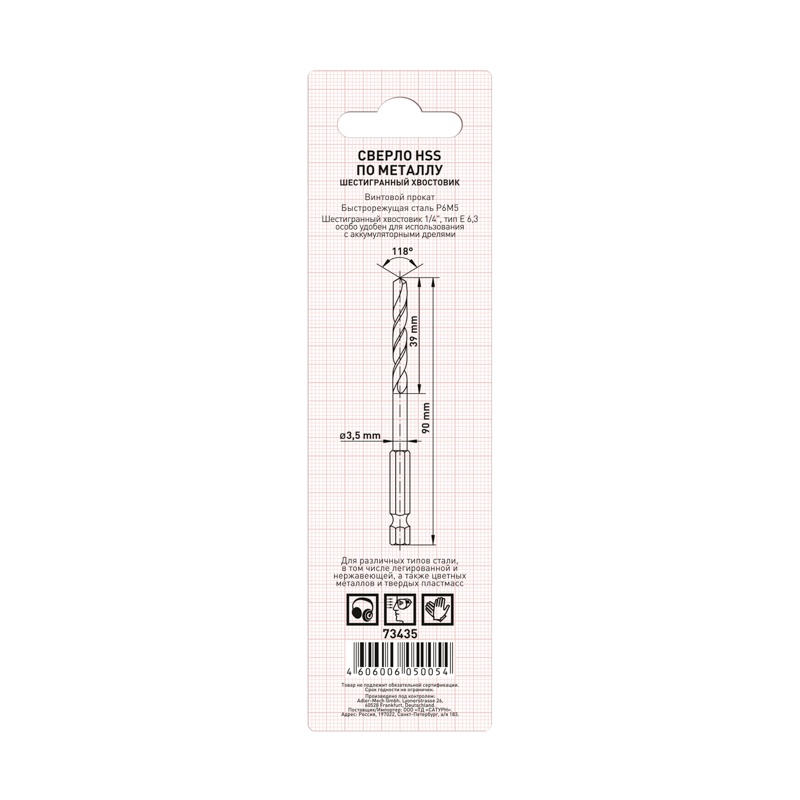 Применяется для создания отверстий в различных типах стали, в том числе легированной и нержавеющей, а также цветных металлов и твердых пластмасс. Для использования с электрическими и аккумуляторными дрелями. Винтовой прокат. Высококачественная быстрорежущая сталь P6M5. Угол при вершине 118 градусов. Шестигранный хвостовик 1/4”, тип Е 6,3 особо удобен для использования с аккумуляторными дрелями.