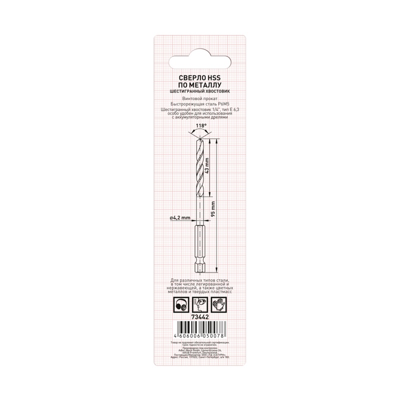 Применяется для создания отверстий в различных типах стали, в том числе легированной и нержавеющей, а также цветных металлов и твердых пластмасс. Для использования с электрическими и аккумуляторными дрелями. Винтовой прокат. Высококачественная быстрорежущая сталь P6M5. Угол при вершине 118 градусов. Шестигранный хвостовик 1/4”, тип Е 6,3 особо удобен для использования с аккумуляторными дрелями.