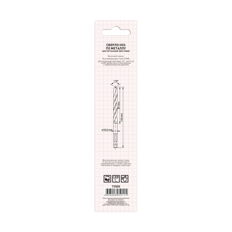 Применяется для создания отверстий в различных типах стали, в том числе легированной и нержавеющей, а также цветных металлов и твердых пластмасс. Для использования с электрическими и аккумуляторными дрелями. Винтовой прокат. Высококачественная быстрорежущая сталь P6M5. Угол при вершине 118 градусов. Шестигранный хвостовик 1/4”, тип Е 6,3 особо удобен для использования с аккумуляторными дрелями.