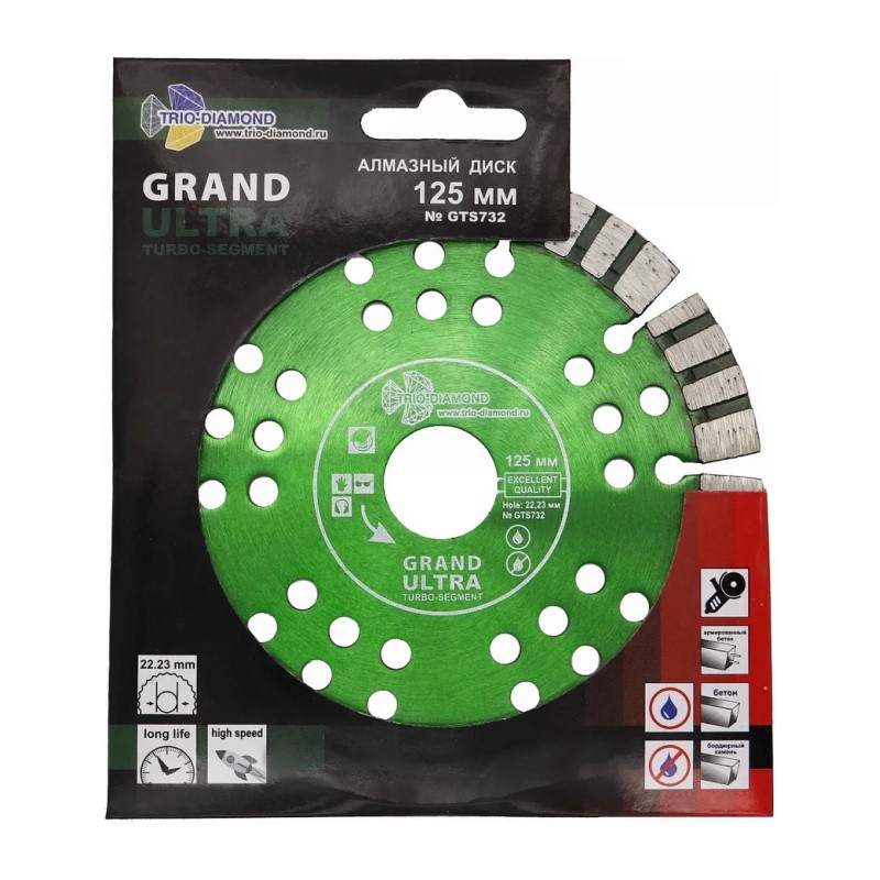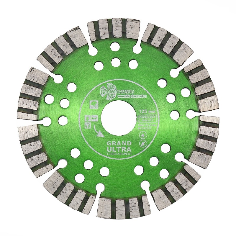 Предназначен для резки армированного бетона, слабо армированного бетона, бетона, огнеупоров, кирпича, тротуарной плитки, бордюрного камня, гранита, мрамора. Подходит для резки материалов повышенной твердости. Турбо-сегментные диски произведены методом горячего прессования с компенсационными отверстиями для дополнительного охлаждения.