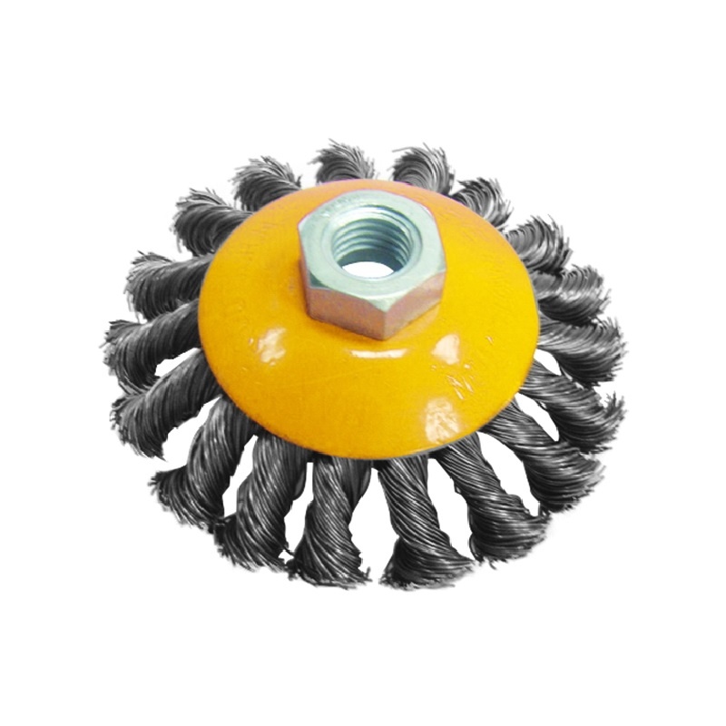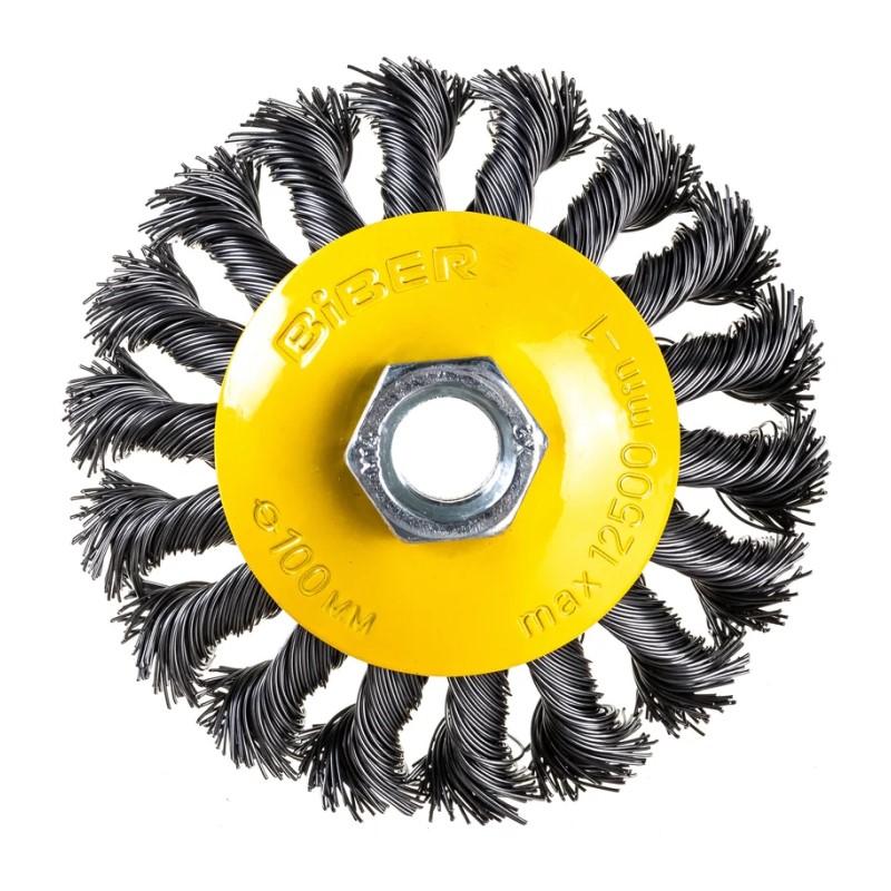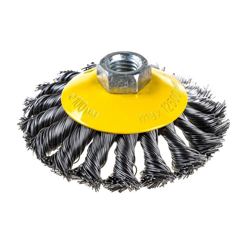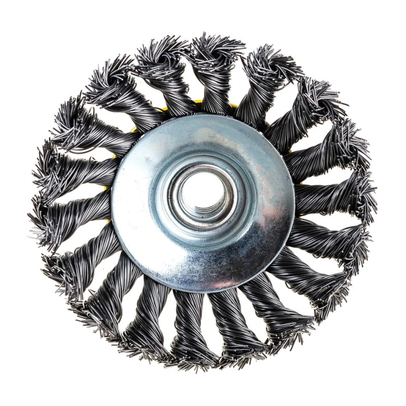 Используется в качестве насадки для УШМ (болгарок) для крацевания поверхностей. Посадочное отверстие — гайка М14. Стальная витая проволока диаметром 0,5 мм, увеличивает жесткость, прочность и износостойкость.