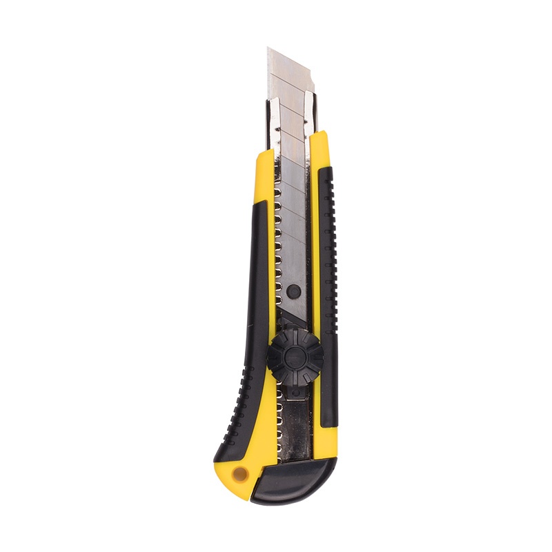 Предназначен для резки бумаги, картона, ткани и пластика. Пластмассовый обрезиненный корпус. Металлическая направляющая. Оснащен отламывающимся сегментированным лезвием, комплектуется 3 запасными лезвиями.