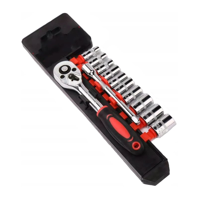 Набор состоит из 12 предметов: трещотка 1/4 дюйма, удлинитель, 10 торцевых головок AV-011412.