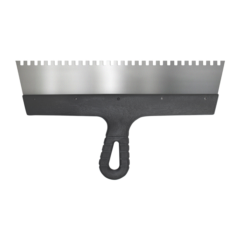 Предназначен для нанесения и выравнивания строительных смесей. Зубчатое полотно из нержавеющей стали. Рукоятка из пластмассы.
