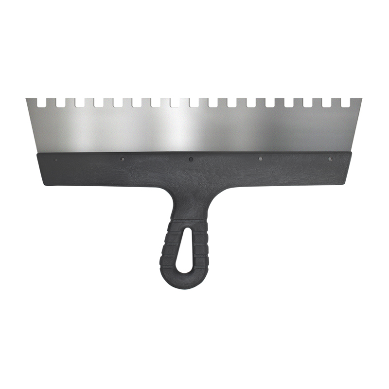 Предназначен для нанесения и выравнивания строительных смесей. Зубчатое полотно из нержавеющей стали. Рукоятка из пластмассы.