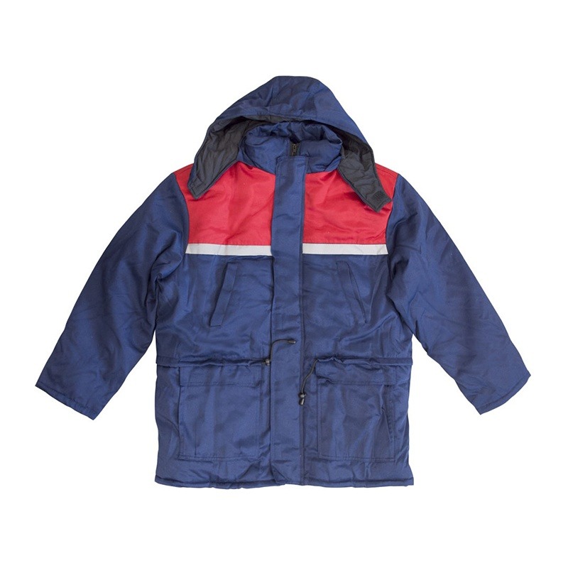 Используется в качестве защитной спецодежды при проведении работ в условиях пониженных температур. Куртка на пуговицах из смесовой ткани Балтекс плотностью 260 г/м2 (65% хлопок, 35% синтетика), темно-синего цвета с кокеткой красного цвета. Отложной воротник. Рукава-манжет на пуговицах. 4 накладных кармана: верхние с клапаном на липучке, нижние с косым входом. Пояс с двух сторон на резинке.