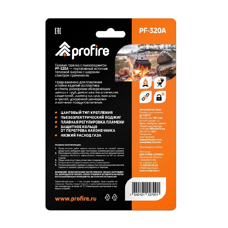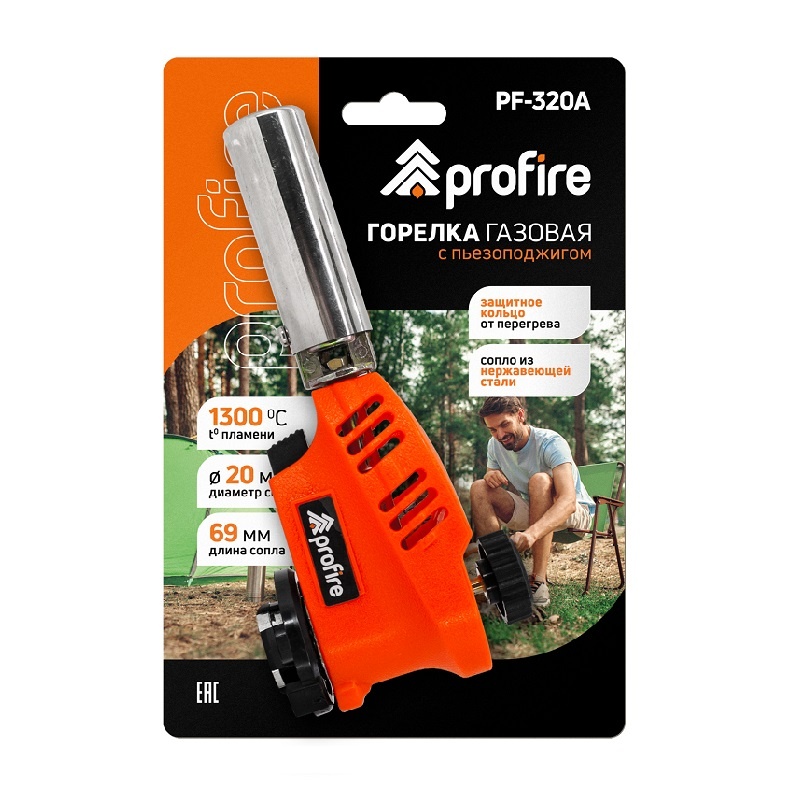 Газовая горелка с пьезоподжигом PF-320A – портативный источник тепловой энергии с широким спектром применения. Предназначена для плавления и пайки изделий из пластика и стекла, разморозки обледеневших замков и труб, демонтажа металлических соединений, розжига костров, мангалов и грилей, ускоренной разморозки и копчения продуктов питания. Имеет цанговый тип крепления, пьезоэлектрический поджиг, плавную регулировку пламени. Сопло выполнено из нержавеющей стали. Длина сопла: 64 мм.