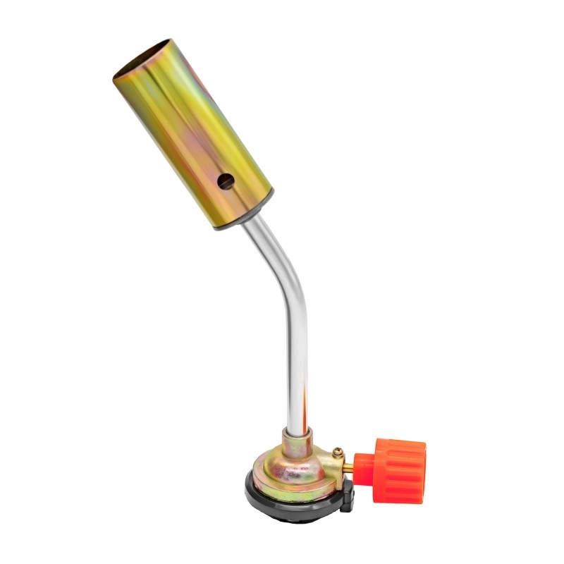 Предназначена для установки на баллон и создает устойчивое, не подверженное воздействию ветра и дождя пламя температурой 1300°С. Расход газа максимум 73 г/час. Есть регулятор уровня пламени. Габариты 180х40х105 мм. Диаметр сопла 25 мм, вес горелки 82 г, угол ротации 180 градусов. Без пьезо-поджига.