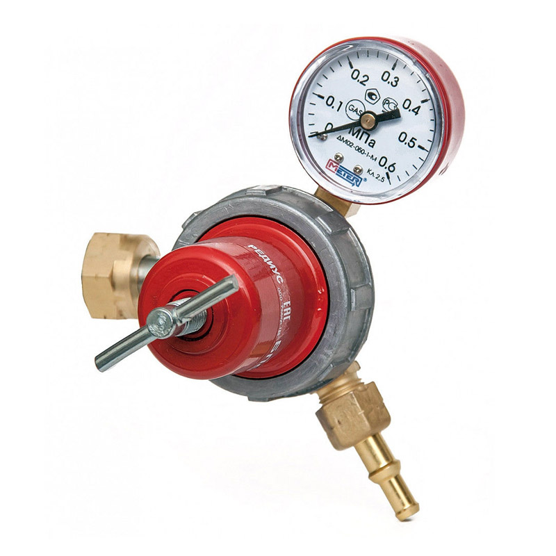 Выполнен по осевой схеме, за счет чего обладает компактными размерами при сохранении всех рабочих параметров на уровне крупногабаритных редукторов. Редуктор предназначен для понижения и регулирования давления газа (пропана), поступающего из баллона, и автоматического поддержания постоянного рабочего давления газа при питании постов и установок газовой сварки, резки, пайки и других технологических процессов. Оснащен манометром. Пропускная способность 5 м3/час. Рабочее давление 0,3 МПа