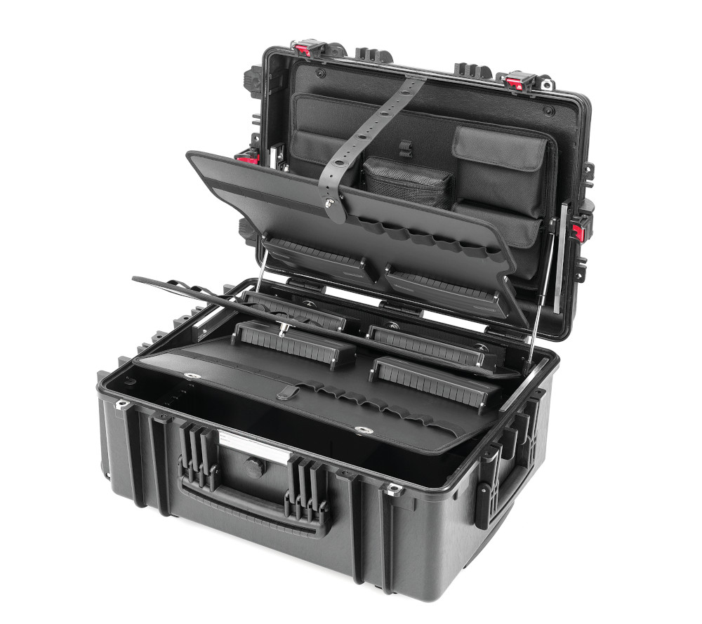 Он защищает содержимое от воды и пыли, герметичен, устойчив к кислотам, давлению, ударопрочен и практически не разрушается. Два устойчивых ролика обеспечивают надежную транспортировку. Размеры: 630 x 490 x 300 мм. Вес пустого чемодана: 14,5 кг. Поставляется без инструмента.