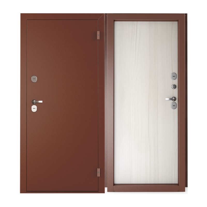Дверь комплектуется 2 замками: это сувальдный замок Гардиан 30.11 четвертого класса безопасности и сувальдный замок Промет 30.01 третьего класса безопасности, а также алюминиевой дверной ручкой Inspector 93 в цвете хром. Применение пенополистирола в качестве внутреннего наполнителя, обеспечивает низкую теплопроводность и высокую звуконепроницаемость. Дверь покрыта износостойкой полимерно-порошковой краской имеет три контура уплотнения, которые обеспечивает защиту от сквозняков и шума. Внутренняя сторона двери выполнена в виде МДФ панели.
