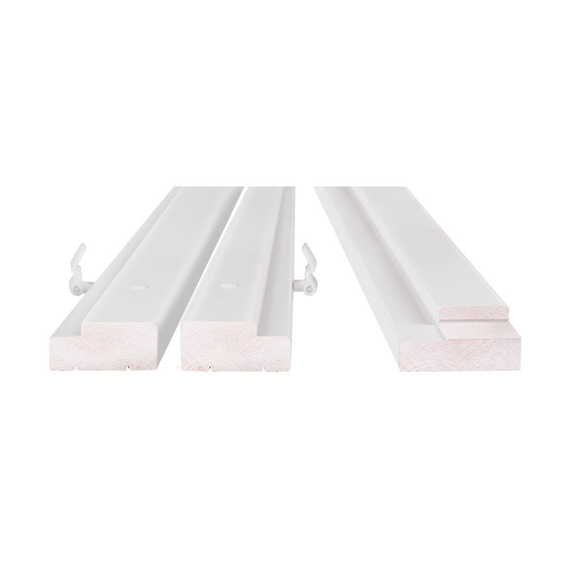 Предназначена для монтажа межкомнатных дверей. Комплект двупольной дверной коробки состоит из двух стоевых и перекладины, изготовленных из срощенного бруса хвойных пород, сечением 38х85 мм, окрашенного белой краской УФ отверждения, с 4 установленными петлями FT-65, заглушками для монтажных отверстий.