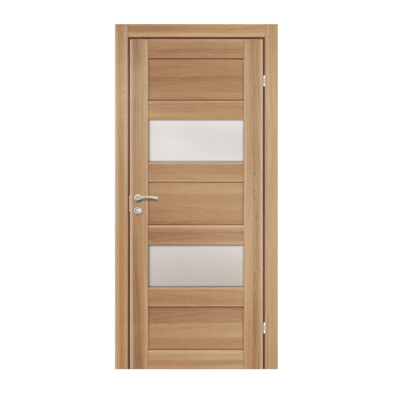 Предназначено для установки в межкомнатный дверной блок. Дверное полотно с притвором остекленное. Царговая конструкция выполнена из массива сосны и(или) МДФ. Поверхность — МДФ с покрытием экошпон. Установлен замок модель 2014, 2 резьбовые втулки с винтом для крепления петель. Выполнена фрезеровка 2 отверстий под ручку и цилиндр (завертку).