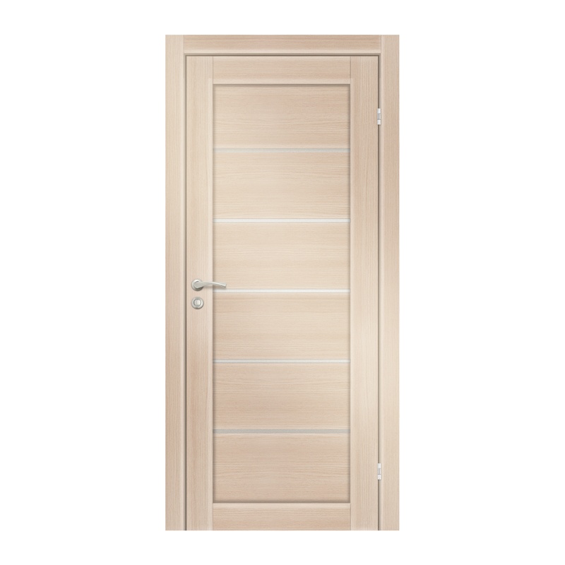 Предназначено для установки в межкомнатный дверной блок. Дверное полотно без притвора остекленное. Царговая конструкция выполнена из массива сосны и(или) МДФ. Поверхность — МДФ с покрытием экошпон. Поставляется без фурнитуры.