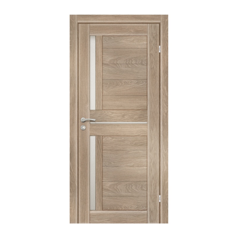 Предназначено для установки в межкомнатный дверной блок. Дверное полотно без притвора остекленное. Царговая конструкция выполнена из массива сосны и(или) МДФ. Поверхность — МДФ с покрытием экошпон. Поставляется без фурнитуры.