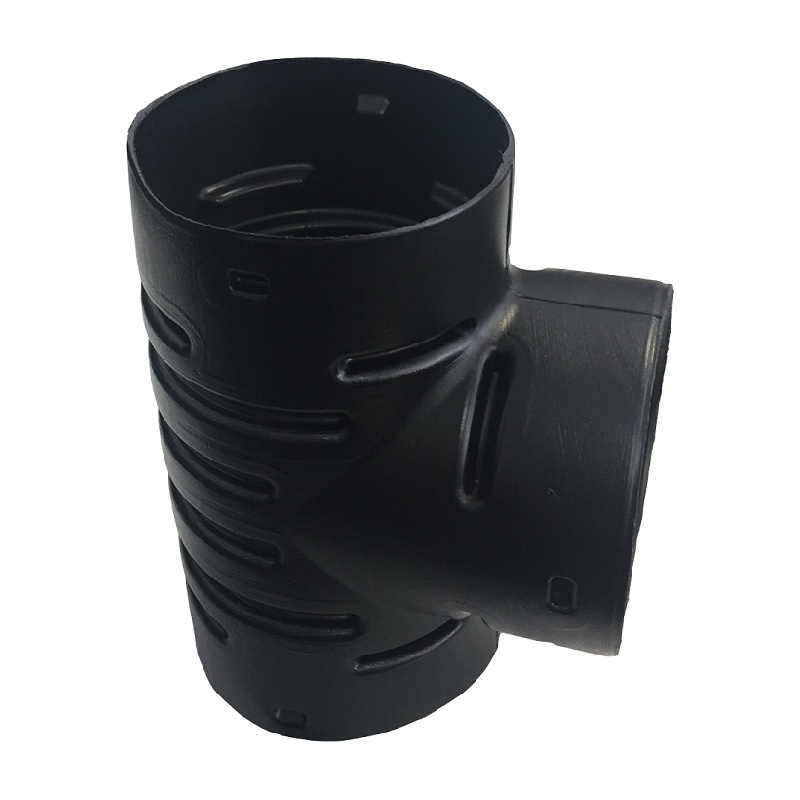 Предназначен для соединения труб в Т-образный узел. Представляет собой пластиковый элемент в виде буквы «Т» со специальными фиксирующими выступами с внутренней стороны, обеспечивающими надежное соединение. Для качественного соединения тройника и дренажной трубы конец трубы должен быть отрезан перпендикулярно оси по впадине гофра, вставленная в тройник труба должна заходить за фиксирующие выступы тройника на две вершины гофра.