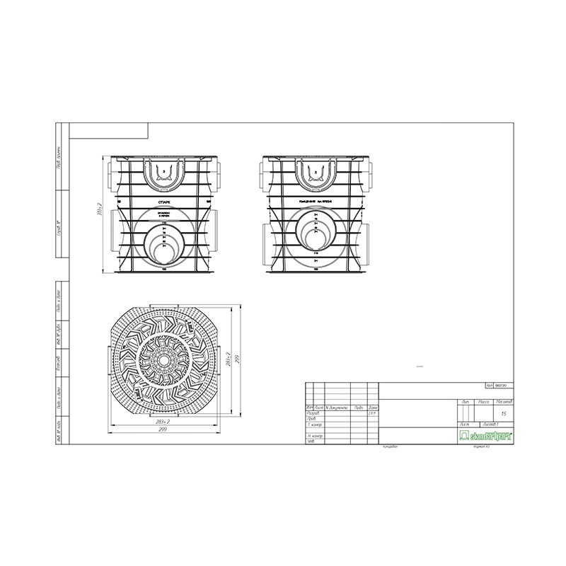 Поставляется в сборе с круглой пластиковой решеткой. Внутри дождеприемника находится корзина для сбора мусора, который смывается ливневыми водами. Дождеприемник имеет фланцы для соединения с канализационными трубами для отведения собранных вод из дождеприемника в канализационную систему. Также к дождеприемнику можно подключать водоотводные лотки с сечением DN100. Для этого с каждой стороны дождеприемника имеются фланцы соединения с лотками.