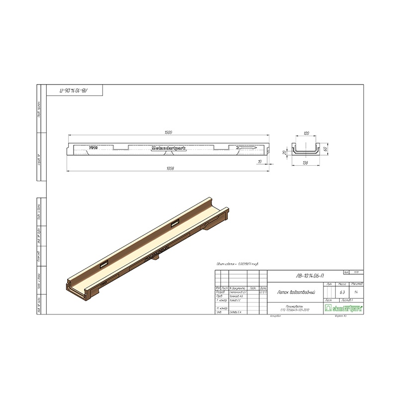 Предназначен для устройства поверхностного водоотвода с территорий подверженных средним нагрузкам — парковки для легковых автомобилей, тротуары и др. Не боятся воздействий температуры, химических и других веществ. Гидравлическое сечение лотка DN100. Выдерживает нагрузки в диапазоне классов А15 — С250. Имеет выходы для подсоединения канализационной трубы d=60-110мм, других лотков этой же серии, а также пескоуловителей и дождеприемников. Сверху лоток должен накрывается чугунной 20303, стальной 2010 или пластиковой 208019 решеткой. От выбора решетки будет зависеть класс выдерживаемой нагрузки.