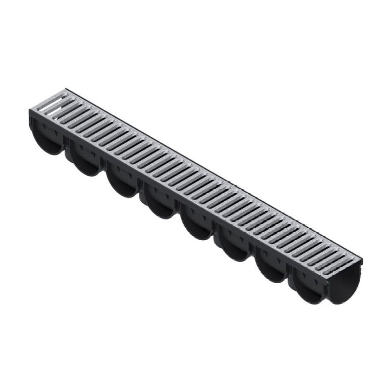 Предназначен для устройства поверхностного водоотвода с территорий подверженных средним нагрузкам — тротуары, пешеходные зоны, велосипедные дорожки, приусадебные участки и др. Гидравлическое сечение лотка DN100. Поставляется в комплекте со стальной оцинкованной решеткой. Выдерживает нагрузки в диапазоне классов А15. Имеет выходы для подсоединения канализационной трубы d=60-110мм, других лотков этой же серии, а также пескоуловителей и дождеприемников.