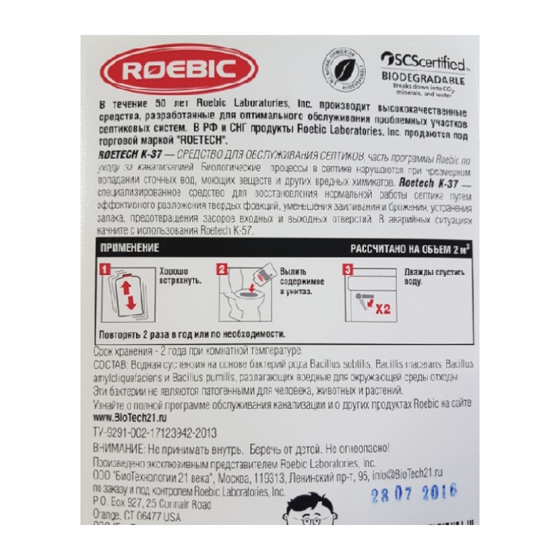 Предназначено для поддержания нормальной работы септика путем эффективного разложения твердых фракций, уменьшения заиливания и брожения, предотвращения засоров входных и выходных отверстий. Применяется 2 раза в год или по необходимости. Флакон объемом 946 мл обслуживает резервуар 2 м3